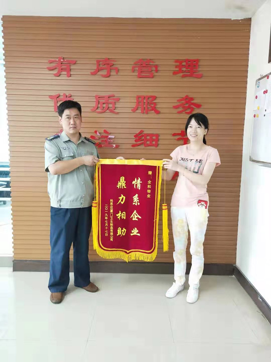 廈門市全和物業(yè)管理有限公司同安工業(yè)集中區(qū)思明園服務(wù)中心的勇士們處置及時,臨危不亂,為業(yè)主挽回了巨大損失,獲得業(yè)主的高度贊揚與認(rèn)可,被送來“情系企業(yè),鼎力相助”的錦旗。