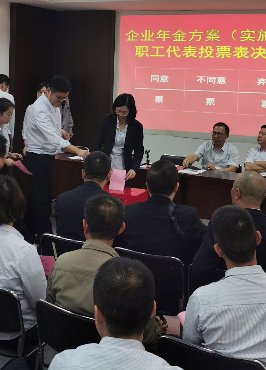 行政部負責人向大會作了《企業(yè)年金方案》的講解和說明,職工代表分組就《企業(yè)年金方案(實施細則)》進行討論,最后與會職工代表以無記名投票方式表決通過了《企業(yè)年金方案(實施細則)》。