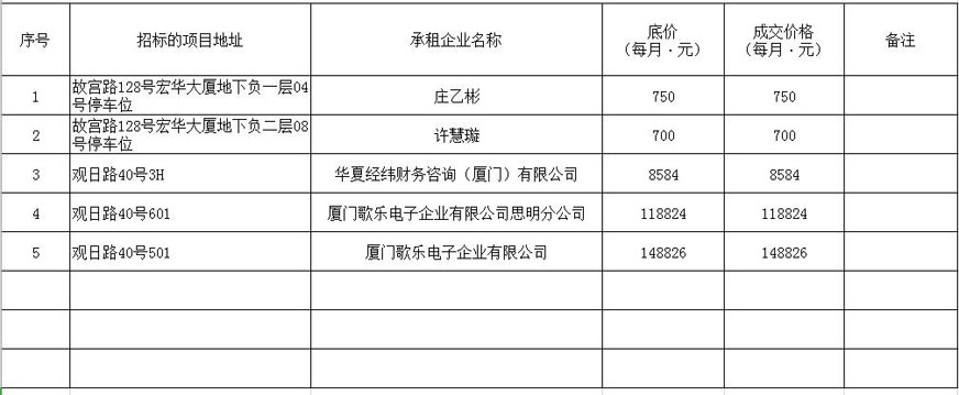 根據(jù)思明區(qū)國(guó)有企業(yè)資產(chǎn)出租管理的相關(guān)制度,我司2020年1月10日上午9:00起于觀音山營(yíng)運(yùn)中心2號(hào)樓2層2號(hào)會(huì)議室進(jìn)行公開(kāi)招租現(xiàn)場(chǎng)開(kāi)標(biāo),現(xiàn)通過(guò)思明控股網(wǎng)站對(duì)外發(fā)布成交公告,內(nèi)容如下: