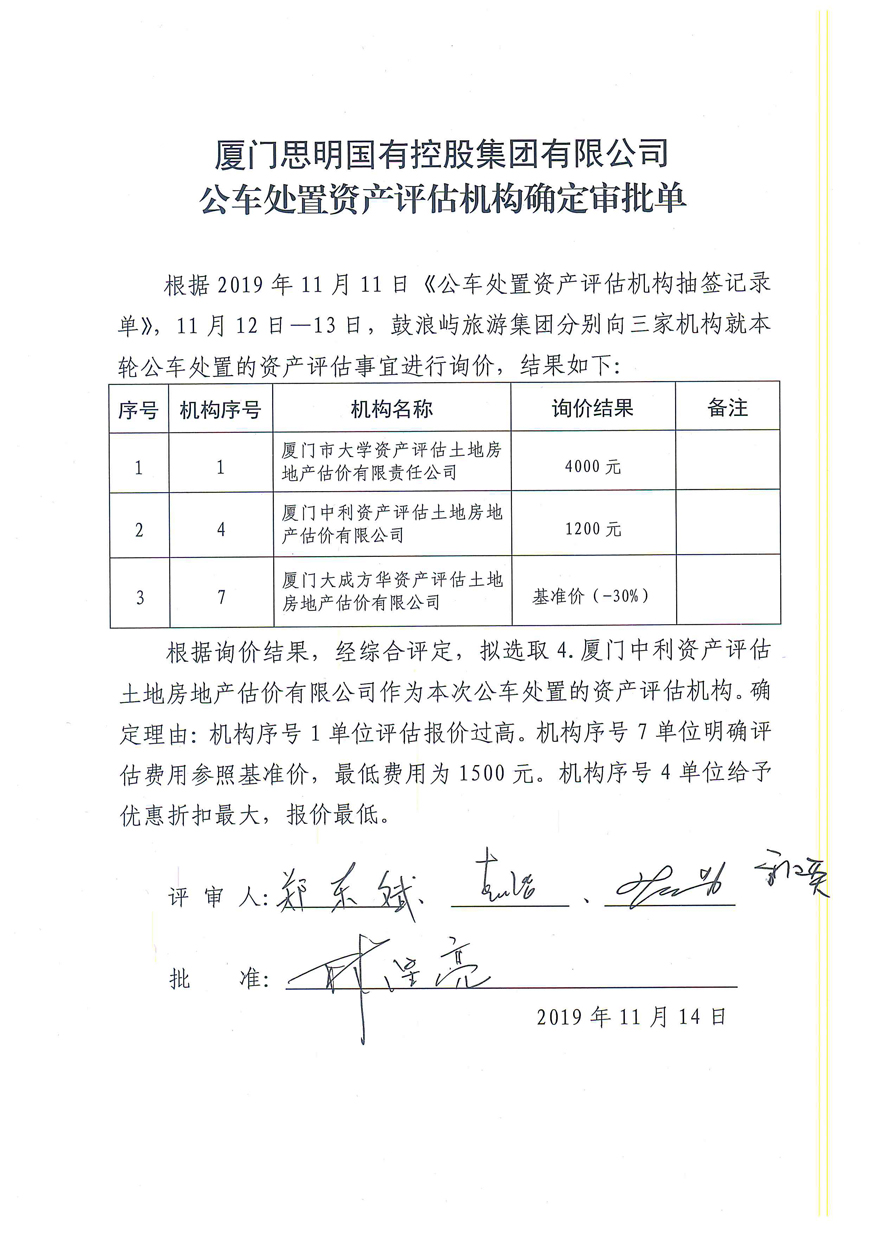 2.《思明控股公車處置(第四批)資產(chǎn)評估機構(gòu)確定審批單》;
