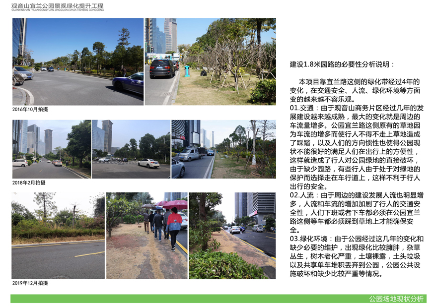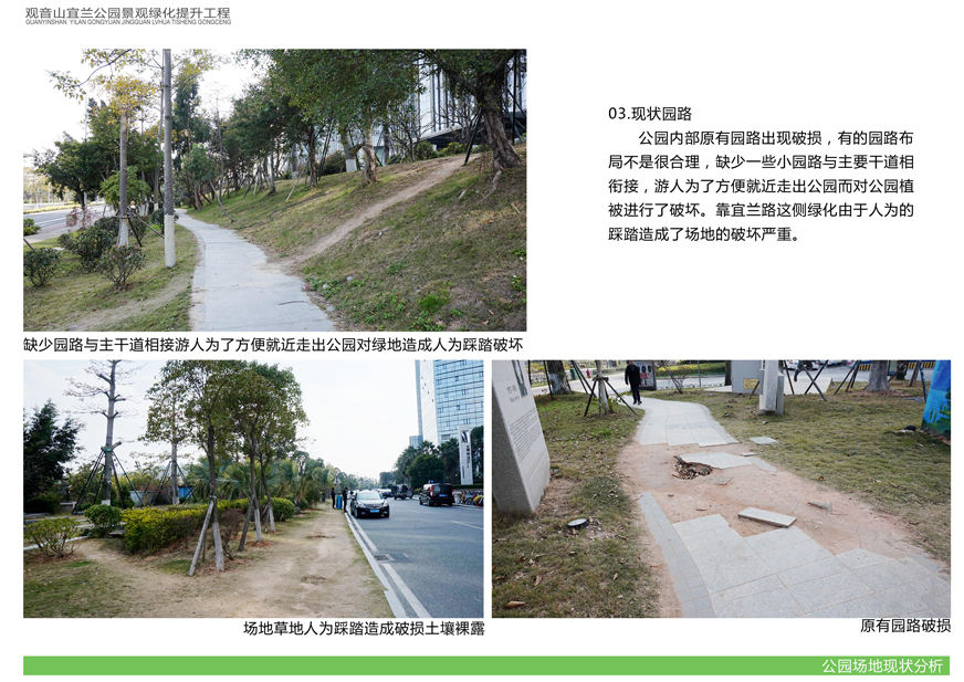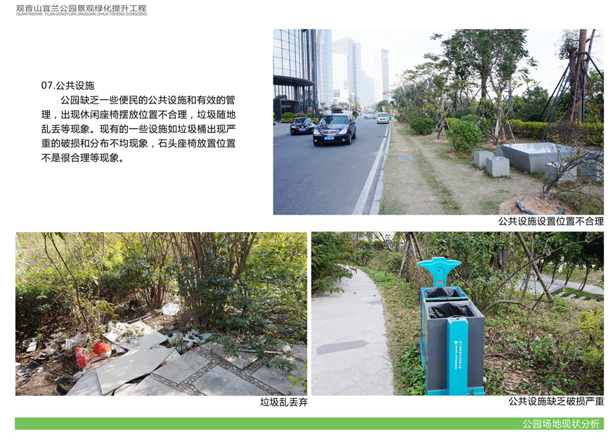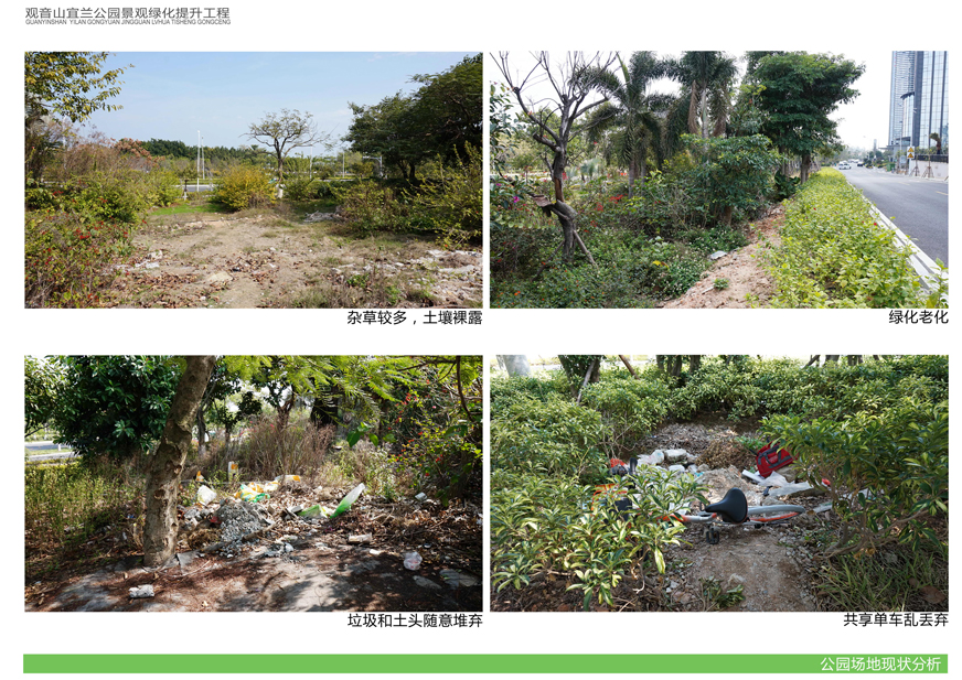 項目位于環(huán)島東路與觀音山商務(wù)營運中心之間,緊鄰城市干道環(huán)島東路及市政道路宜蘭路。該區(qū)域景觀綠化目前存在植被缺少后期養(yǎng)護(hù),雜草較多,并出現(xiàn)倒伏現(xiàn)象,影響人行交通;各類設(shè)施老化,景觀帶內(nèi)垃圾無人清除,造成環(huán)境污染;區(qū)域兩側(cè)靠近車行道,缺少必要的人行園路,安全性較差;配套設(shè)施不完善,澆灌系統(tǒng)布局不合理等問題,嚴(yán)重影響城市形象,因此對現(xiàn)狀綠化進(jìn)行整治十分必要。