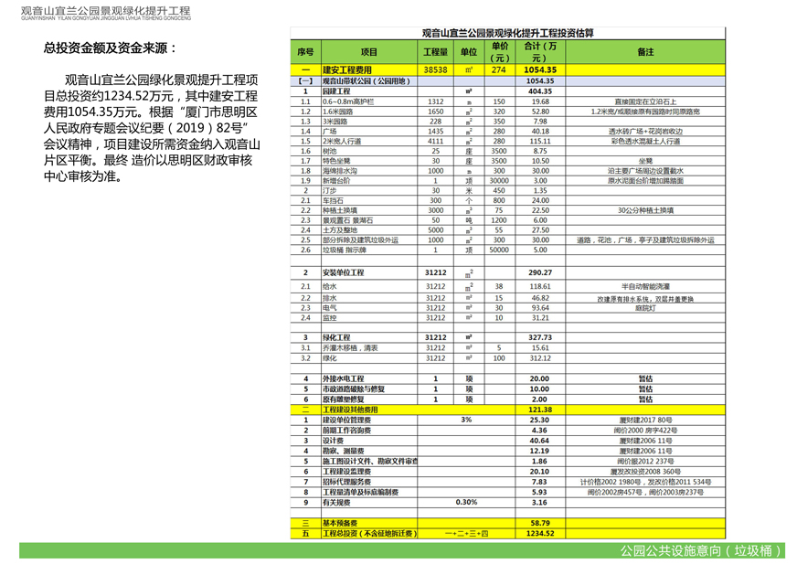 觀音山宜蘭公園景觀綠化提升工程由我司下屬廈門市開元國有投資集團有限公司負(fù)責(zé)建設(shè),項目投資估算為1234.52萬元。