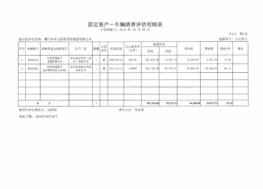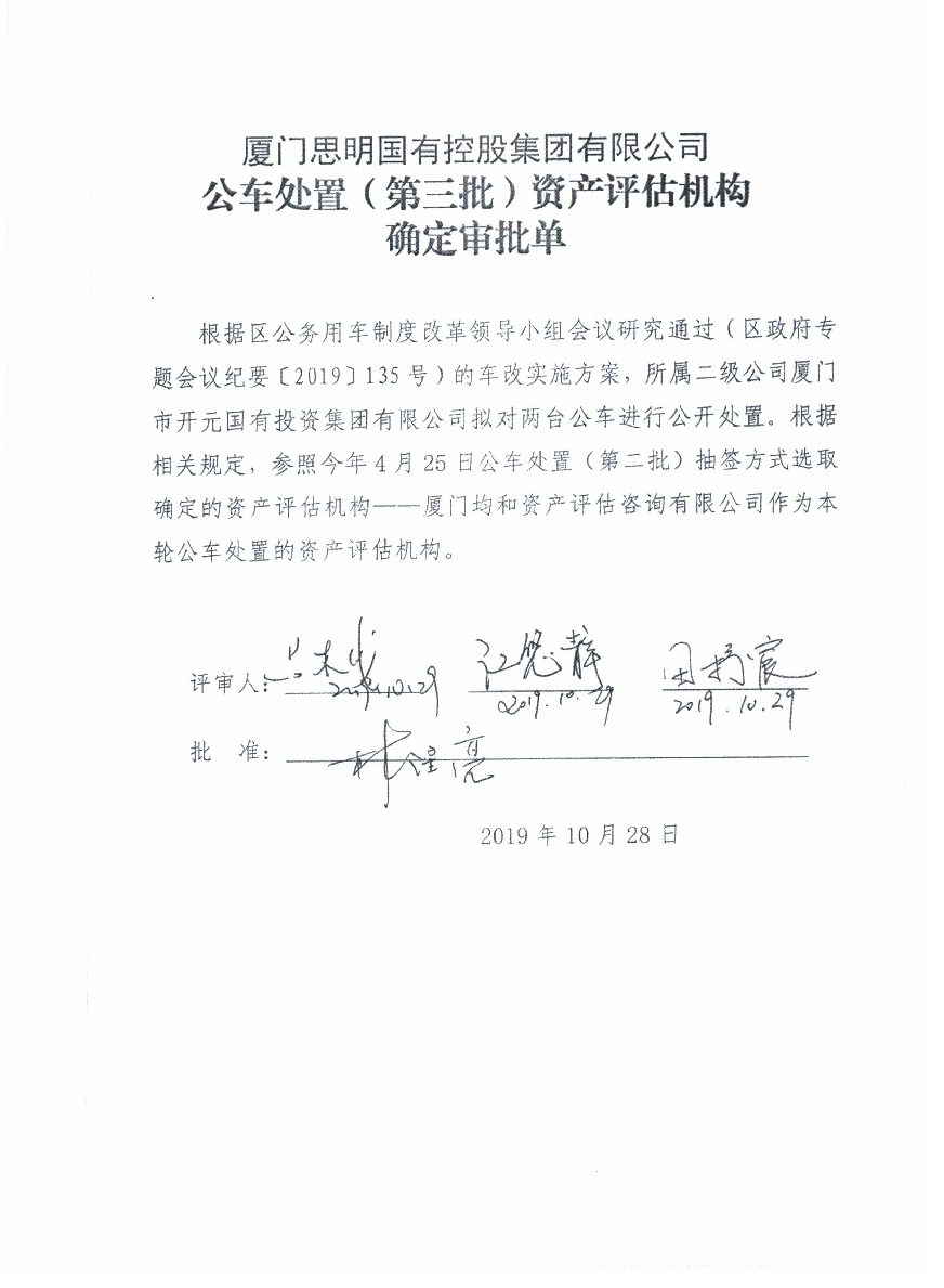 根據(jù)廈門市思明區(qū)人民政府關(guān)于區(qū)屬國企車改實施方案專題會議紀(jì)要(〔2019〕135號)及思明控股《關(guān)于落實車改實施方案相關(guān)事宜的通知》(思明控股辦〔2019〕9號)文的相關(guān)精神。我司委托廈門均和房地產(chǎn)土地評估咨詢有限公司對公車處置(第三批)的資產(chǎn)進(jìn)行評估,該公司已向我司提交資產(chǎn)評估結(jié)果初稿?,F(xiàn)將評估結(jié)果進(jìn)行公示,如有異議,歡迎來電來函反映。