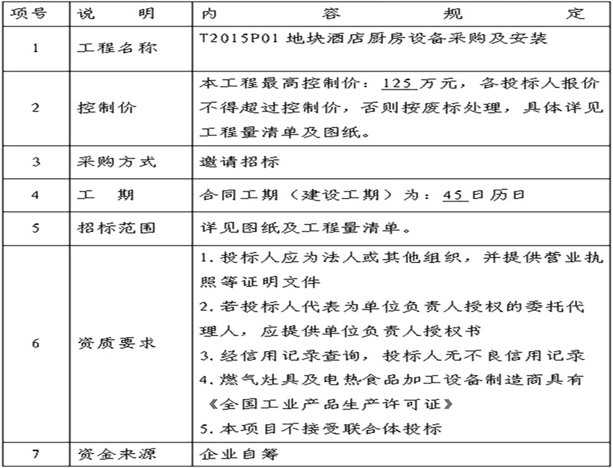 T2015P01地塊酒店廚房設(shè)備采購及安裝