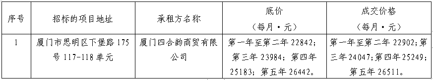 根據(jù)思明區(qū)國(guó)有企業(yè)資產(chǎn)出租管理的相關(guān)制度,我司2021年7月8日上午10:00起于廈門市思明區(qū)臺(tái)東路157號(hào)102單元會(huì)議室進(jìn)行公開招租現(xiàn)場(chǎng)開標(biāo),現(xiàn)通過思明控股網(wǎng)站對(duì)外發(fā)布成交公告,內(nèi)容如下:
