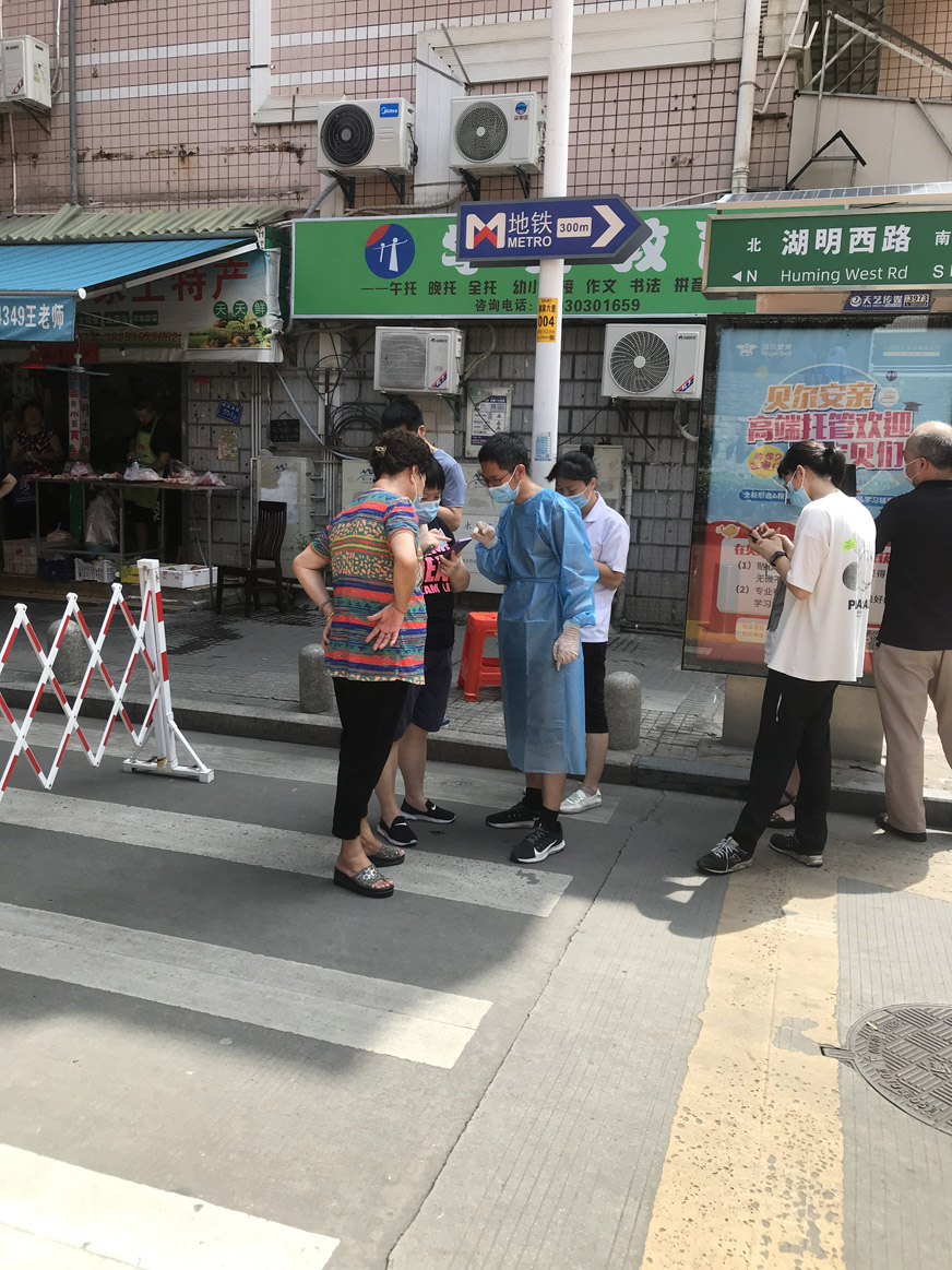 從早7點到晚7點,近12個小時的時間,烈日炎炎的三伏天,排隊進行核酸檢測的群眾換了一撥又一撥,然而穿著不透氣的防護服、連續(xù)奮戰(zhàn)未曾休息的全和抗疫志愿隊員卻始終堅守著各自的崗位。這個隊伍中有人中暑、臉色蒼白;有人正值生理期、腰痛難忍;有人被防護服悶出了一身的疹子,奇癢難耐,大家的衣服濕了又干、干了又濕,戴著手套的手被汗水泡得發(fā)白,但整個“戰(zhàn)隊”沒有一個人有一句抱怨、沒有一個人要求退出。和病毒“賽跑”,每一名黨員都在拼盡全力,大家始終服從指揮,認真配合,全力以赴地完成這次的抗疫增援任務。