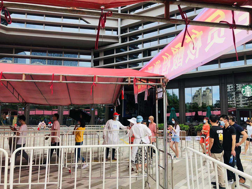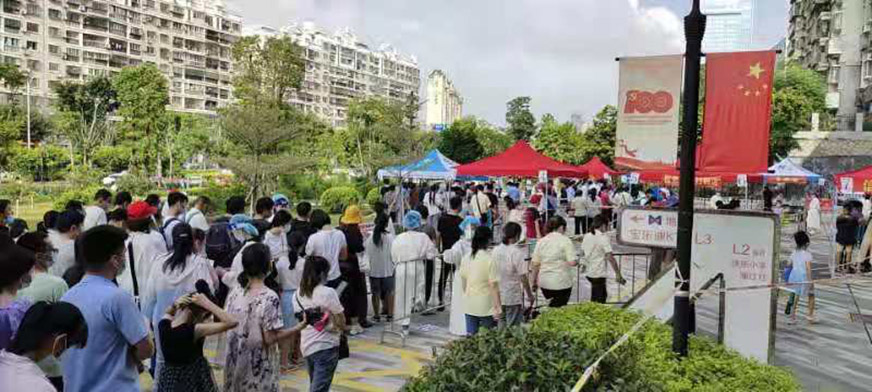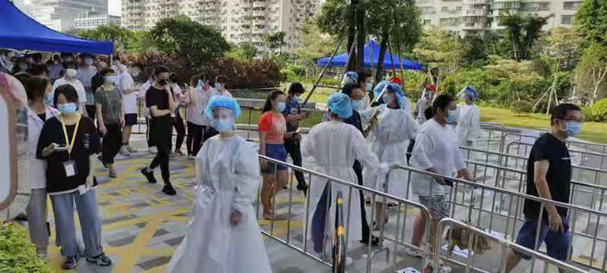 在支援的過程中,他們的額頭、臉部、手腕出現(xiàn)了深深的勒痕,甚至有志愿者出現(xiàn)了中暑虛脫的癥狀,卻仍然頑強(qiáng)地堅(jiān)守著。直到第二輪、第三輪核酸檢測,他們依舊聞令而動,主動請纓,沖鋒在前。