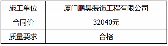 根據(jù)招投標管理辦法、思明控股辦[2021]14號文《采購招標管理辦法》的相關(guān)規(guī)定,我司負責(zé)龍山文創(chuàng)園園區(qū)墻面修補、粉刷及廣告牌噴漆等提升改造工程直接發(fā)包廈門鵬昊裝飾工程有限公司實施,現(xiàn)通過思明控股網(wǎng)站于2021年12月27日至2021年12月30日進行成交結(jié)果公示,內(nèi)容如下:
