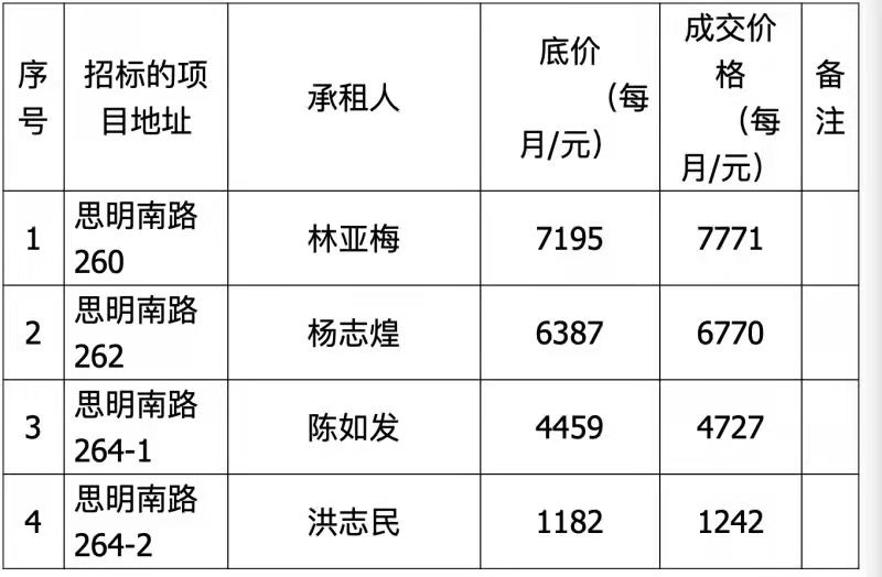 根據(jù)思明區(qū)國有企業(yè)資產(chǎn)出租管理的相關(guān)制度,我司2021年12月27日上午10:00起于觀音山營運(yùn)中心7號(hào)樓2層會(huì)議室進(jìn)行公開招租現(xiàn)場開標(biāo),現(xiàn)通過思明控股網(wǎng)站對(duì)外發(fā)布成交公告,內(nèi)容如下: