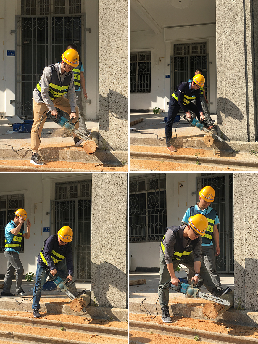 在應(yīng)急搶險(xiǎn)器材中電鋸的操作演練環(huán)節(jié),隊(duì)員們整齊有序,一個(gè)接一個(gè),沒有過關(guān)主動(dòng)再操作一次,一轉(zhuǎn)眼功夫,一塊大長條的原木被隊(duì)員們像切白蘿卜般輕輕松松一塊塊分身落地,場地響起雷鳴般的掌聲。