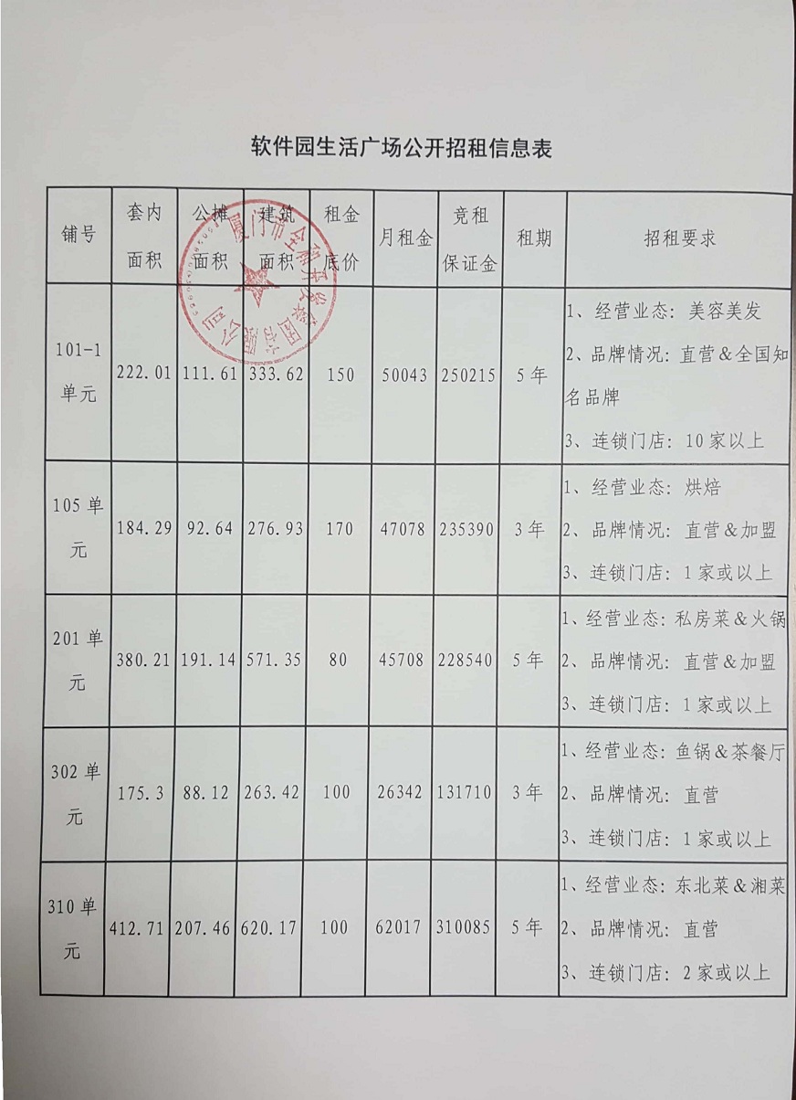 4、招租要求:詳見附表(軟件園生活廣場公開招租信息表)