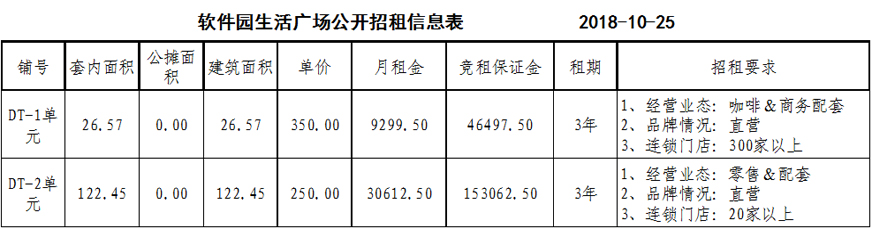 招租要求:詳見附表(軟件園生活廣場公開招租信息表)